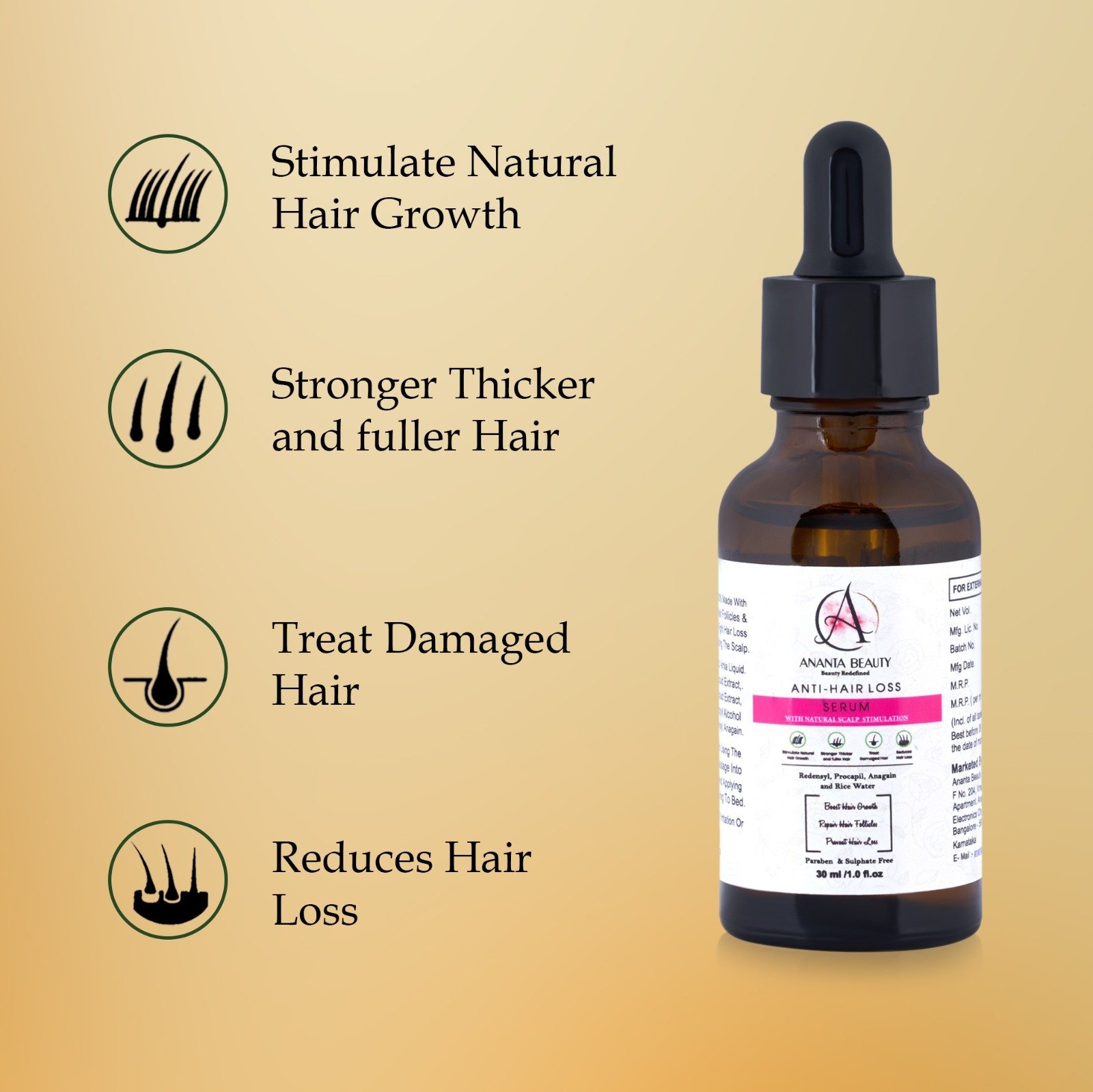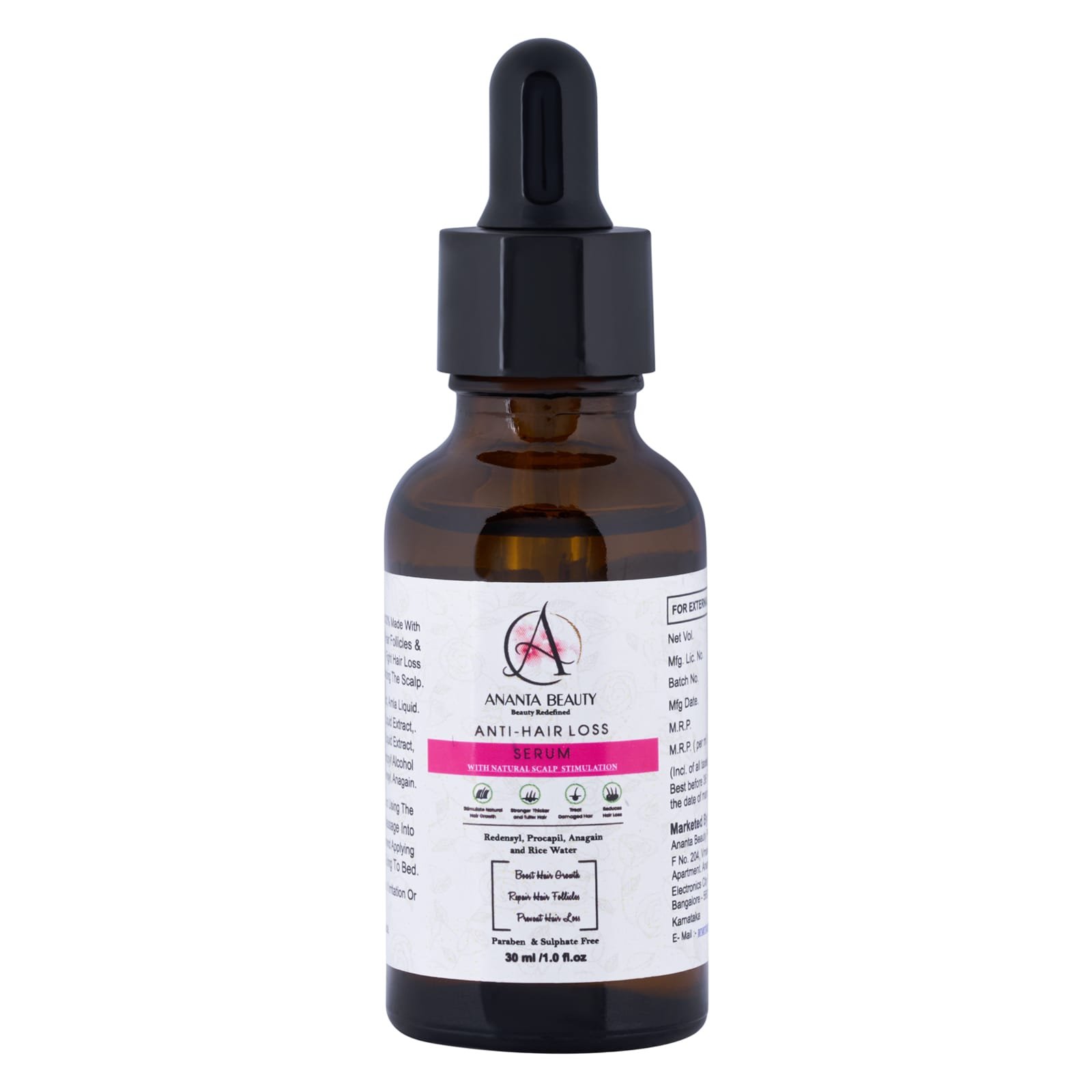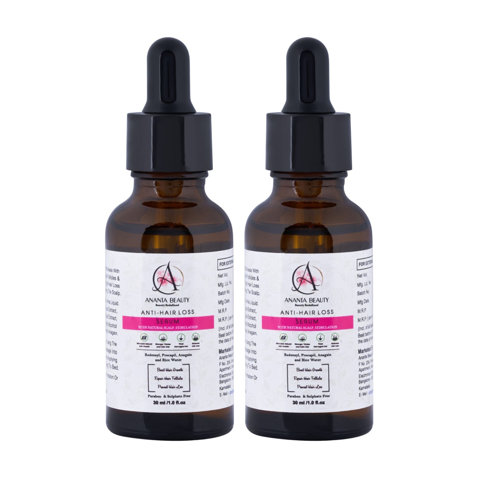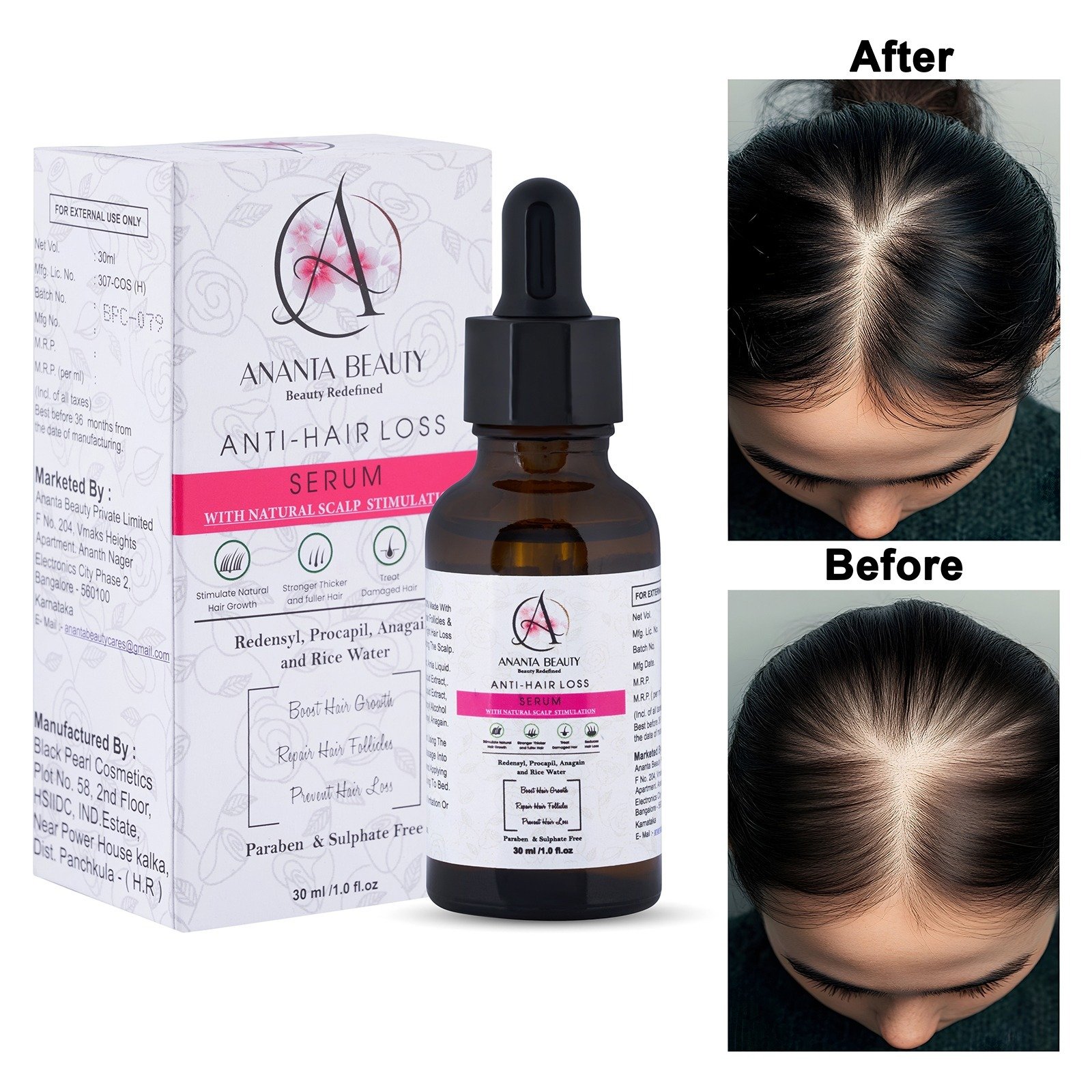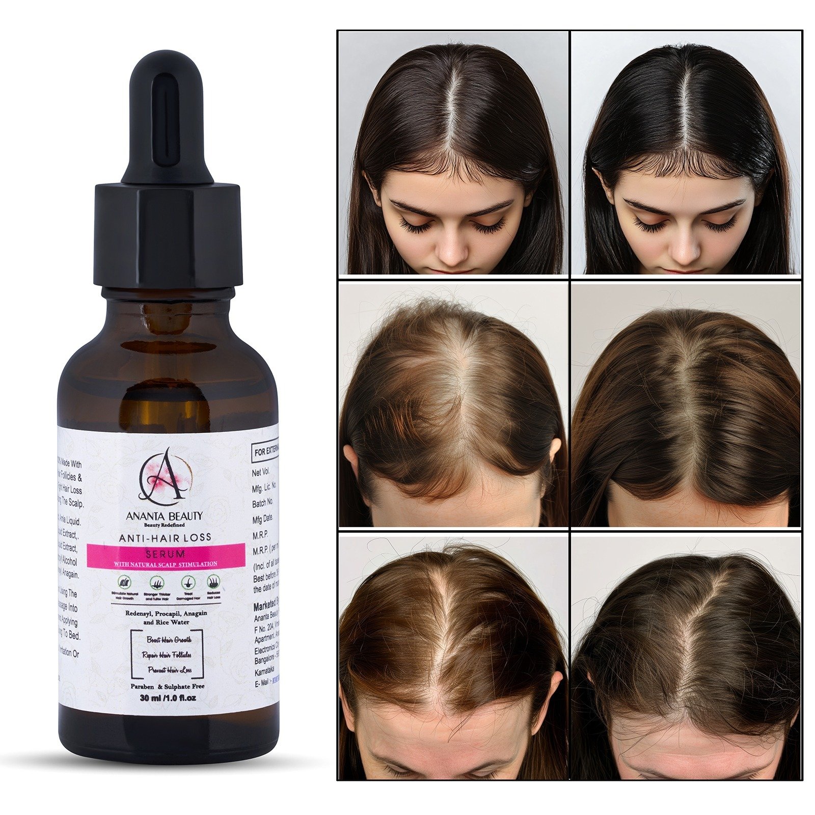 Ananta Beauty Anti-Hair Loss Serum is a scientifically formulated solution designed to reduce hair fall and promote healthy hair regrowth. This lightweight and non-greasy serum works at the root level to nourish the scalp, strengthen hair follicles, and improve overall hair density.