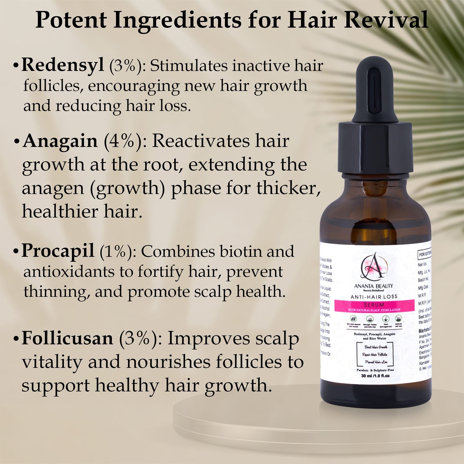 - Follicusan (3%): Nourishes the scalp and supports healthy hair growth