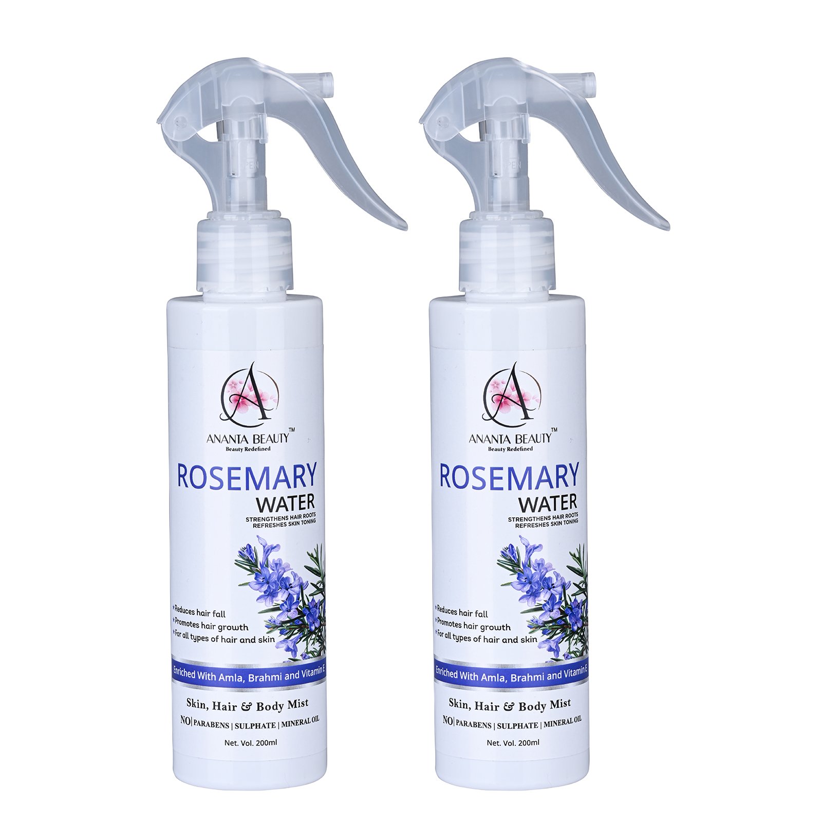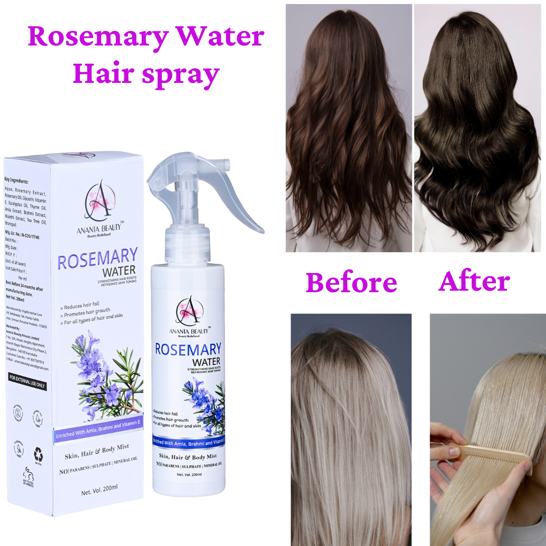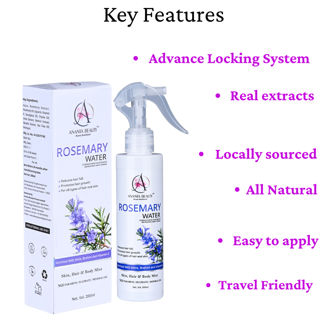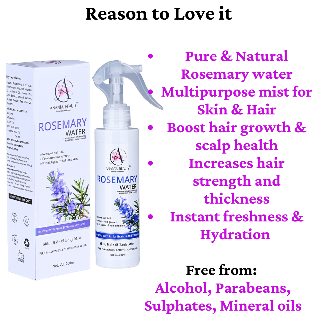 Ananta Beauty Rosemary Water Spray is a refreshing and multi-purpose hair and skin mist designed to promote healthier, stronger, and more vibrant hair. Enriched with natural botanical extracts and essential nutrients, this lightweight formula works directly on the scalp to improve hair growth, reduce hair fall, and enhance overall hair quality.