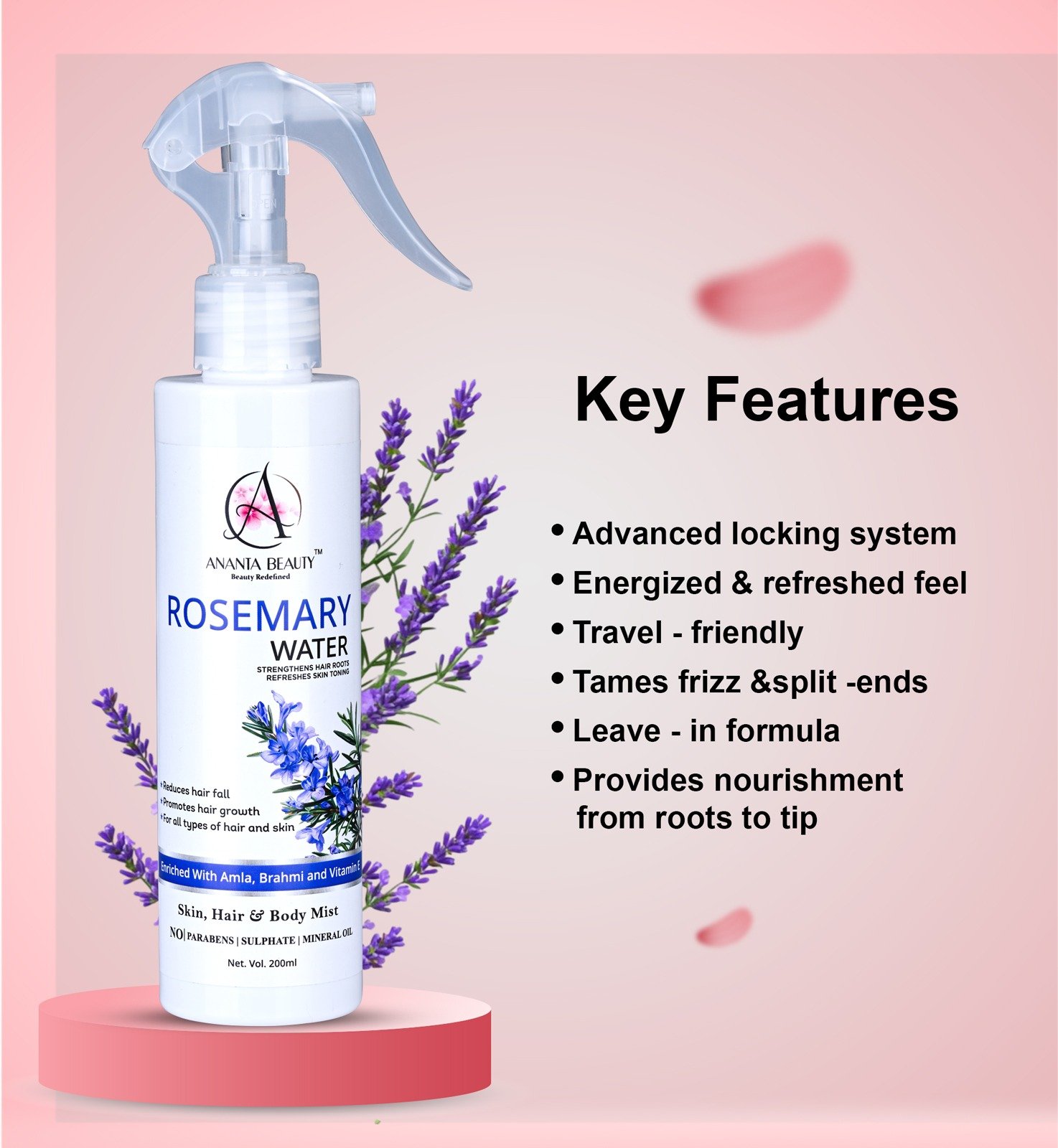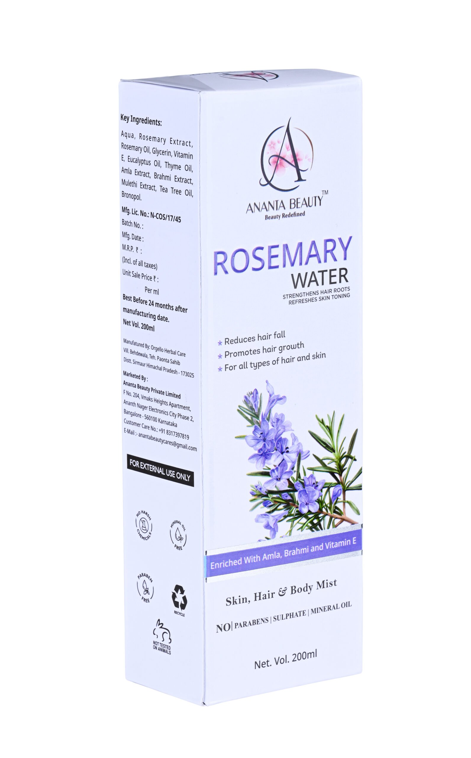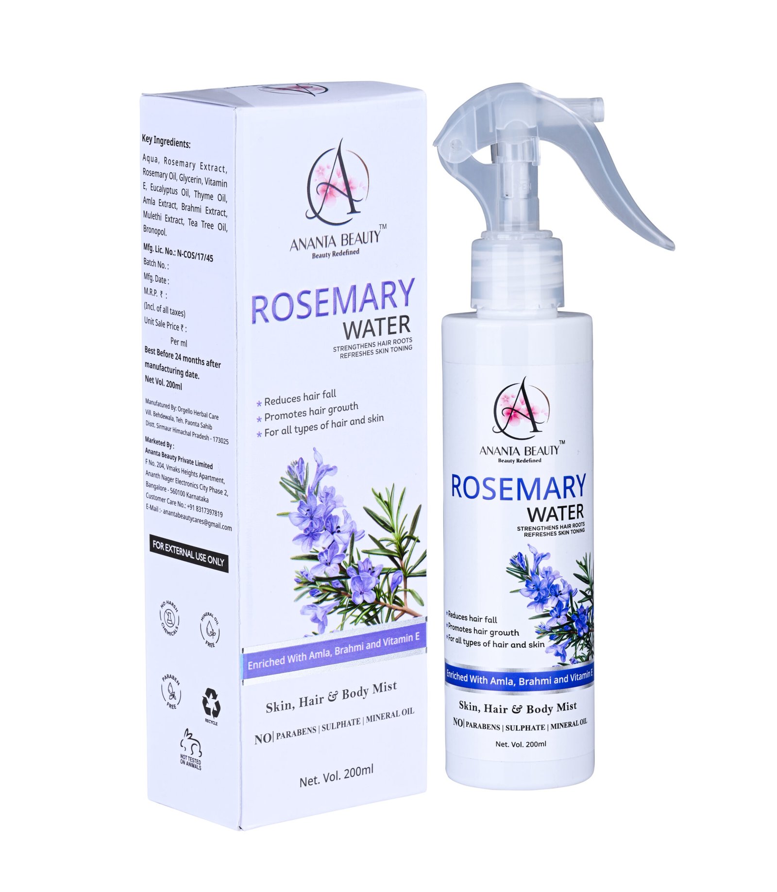 Ananta Beauty Rosemary Water Spray is a refreshing and multi-purpose hair and skin mist designed to promote healthier, stronger, and more vibrant hair. Enriched with natural botanical extracts and essential nutrients, this lightweight formula works directly on the scalp to improve hair growth, reduce hair fall, and enhance overall hair quality.