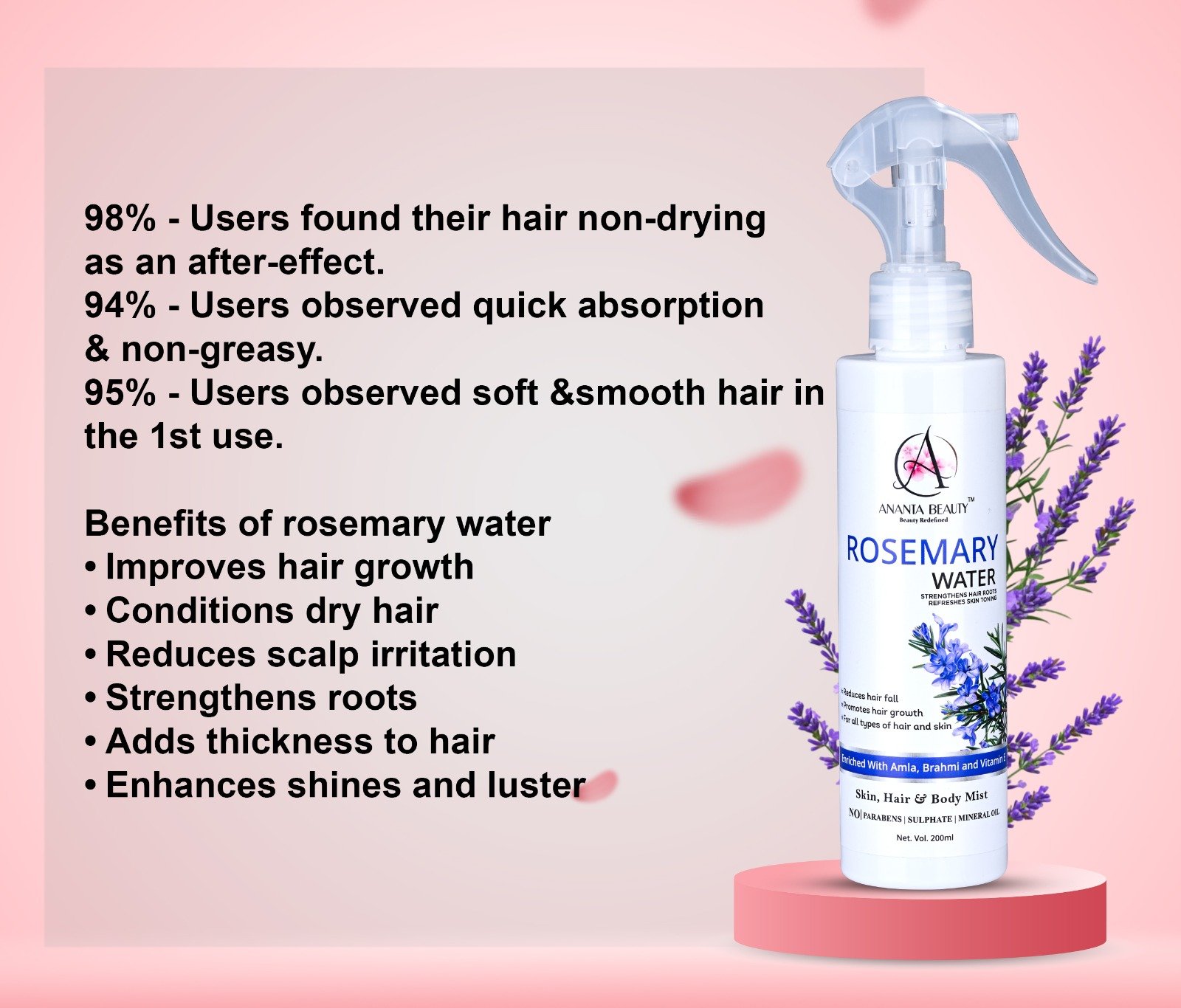 Unlike heavy oils or sticky serums, this rosemary water spray is non-greasy and fast-absorbing, making it ideal for daily use. It can be used as a leave-in treatment for hair or as a refreshing mist for skin, providing instant hydration and revitalization throughout the day.